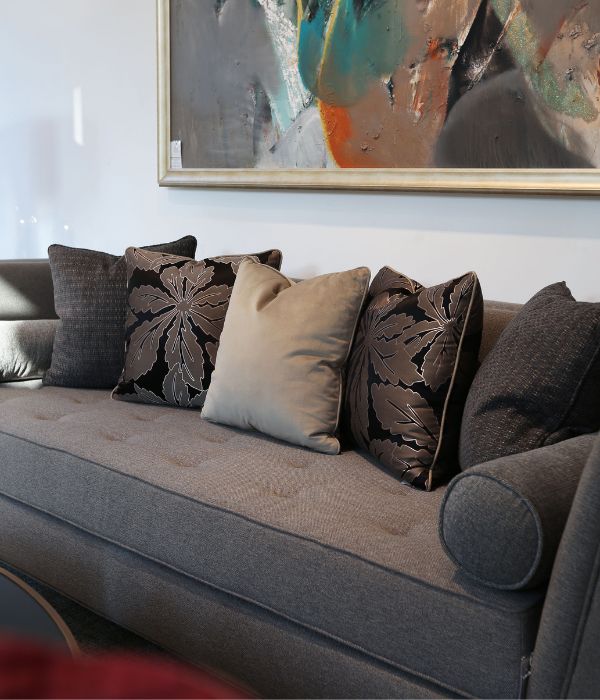 The throw pillows are thoughtfully arranged to create a lively yet harmonious accent, enhancing the overall aesthetic of the interior space.