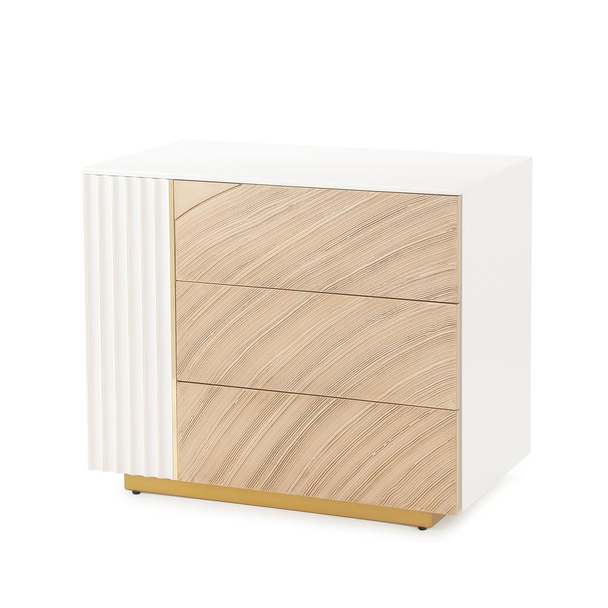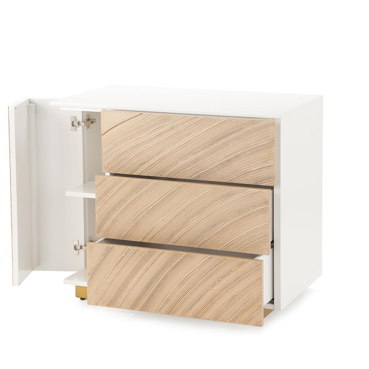 The Province Three-Drawer Chest is an innovative collaboration with renowned abstract artist, Carol Benson-Cobb. Crafted from tulip wood, the piece draws inspiration from traditional pottery techniques. Three push-latch drawers are adorned with a dimensional motif reminiscent of raked clay, finished in a warm Terracotta hue. A corner compartment with a fixed shelf features fluted detailing and a crisp Palazzo finish, matching the rest of the frame. English Brass trim and a matching plinth base provide a refined finishing touch, further elevating the design’s sculptural presence.