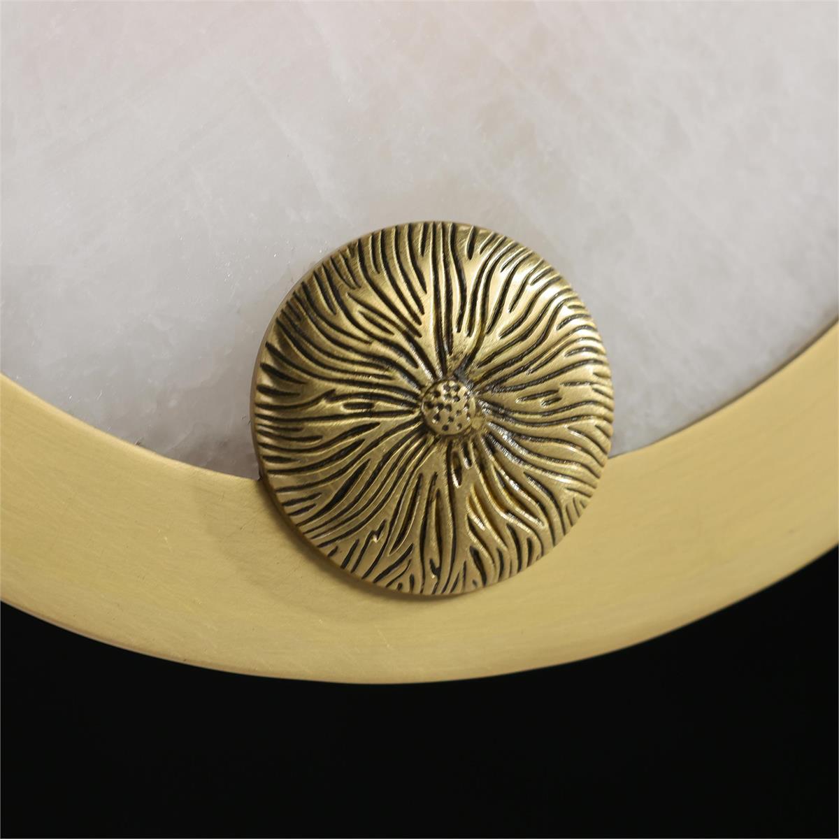 The Astralis Eight-Light Chandelier is a sophisticated design statement that blends rich, contemporary tones with gorgeous natural materials. A rounded Brushed Brass frame displays eight half-circle motifs, each adorned with meticulously detailed florals. Each section showcases circular cuts of white alabaster stone, creating a stunning contrast while gracefully diffusing light to evoke an atmosphere of elegance.