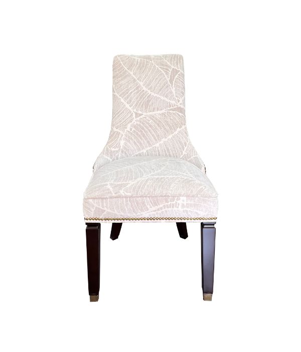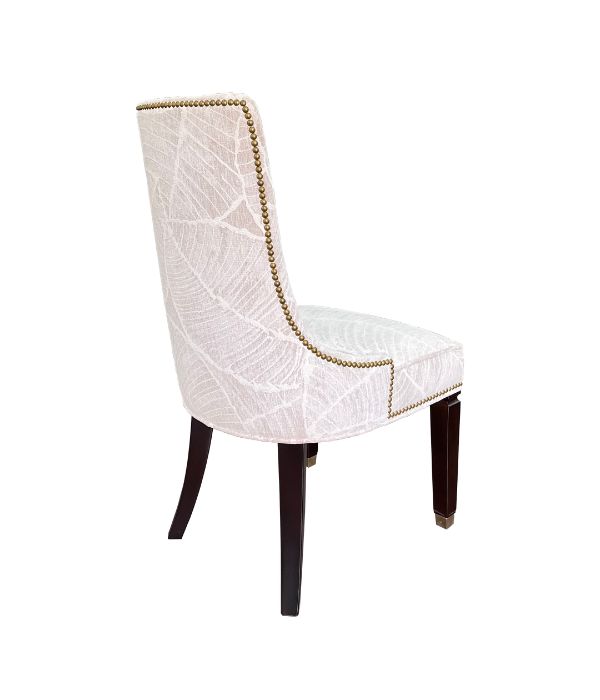Classic dining chair is upholstered in premium fabric featuring a delicate leaf pattern, bringing an elegant and light aesthetic to the space. The high backrest and plush seat cushion provide lasting comfort during use. Decorative nailhead trim, combined with sturdy wooden legs and refined metal caps, adds a luxurious finishing touch—making it a perfect choice for family dining rooms.