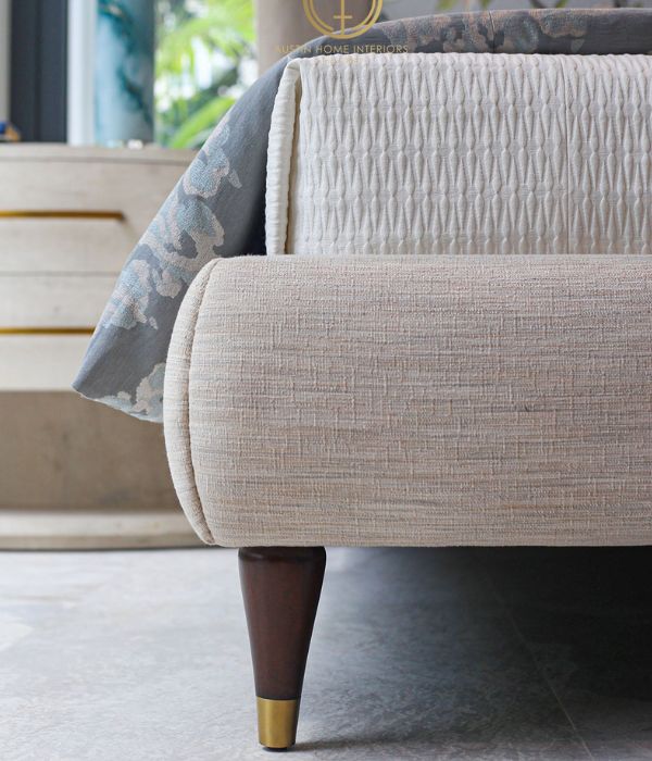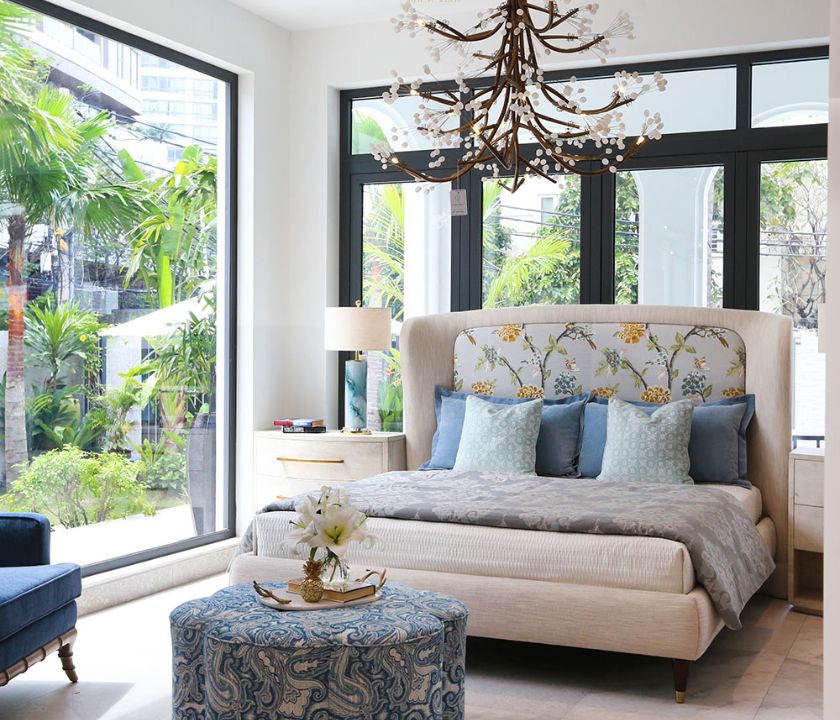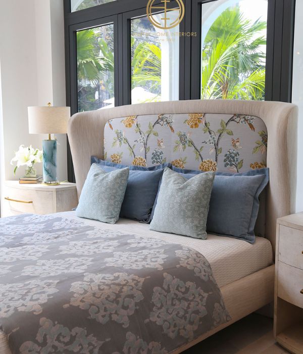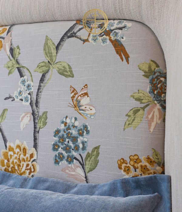 The headboard is upholstered in Robert Allen patterned fabric – an American brand with nearly 90 years of heritage – delicately portraying a bird nestled among a poetic garden of leaves and blooms.