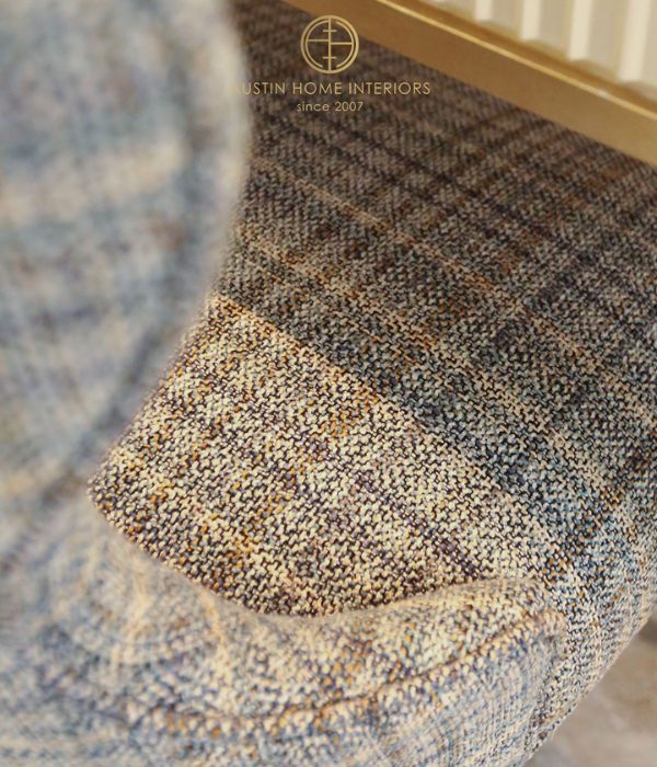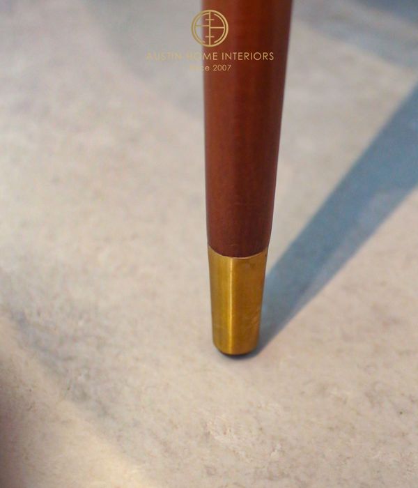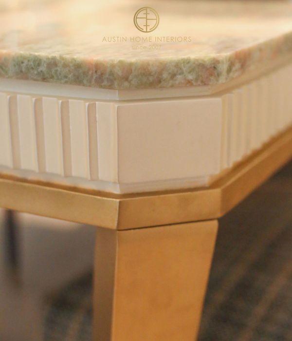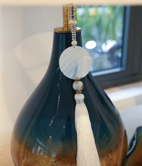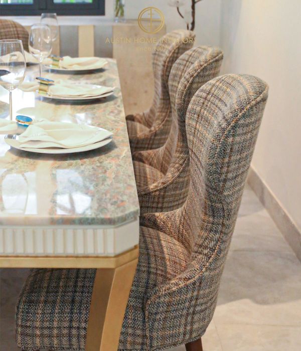 At the heart of the room is the Symphony dining table, featuring a natural marble top with elegant blue and white veining. Each tabletop is a one-of-a-kind creation of nature, never repeated, bringing a truly unique and luxurious statement to your home. The base is meticulously finished with delicate gold leaf detailing, adding a touch of sophistication and timeless elegance. Complementing the table are the Lara dining chairs, upholstered in premium woven fabric from Jim Thompson, highlighted by gently curved backs that offer both comfort and a soft, graceful aesthetic.