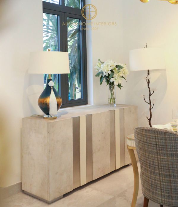 The Pristine cabinet, finished in a refined beluga style, pairs beautifully with the Astralis chandelier from John Richard, creating a warm and elegant focal point. Completing the space is the artistic “Lotus on the Mountain” painting, bringing a sense of serenity and understated elegance to the entire dining room.