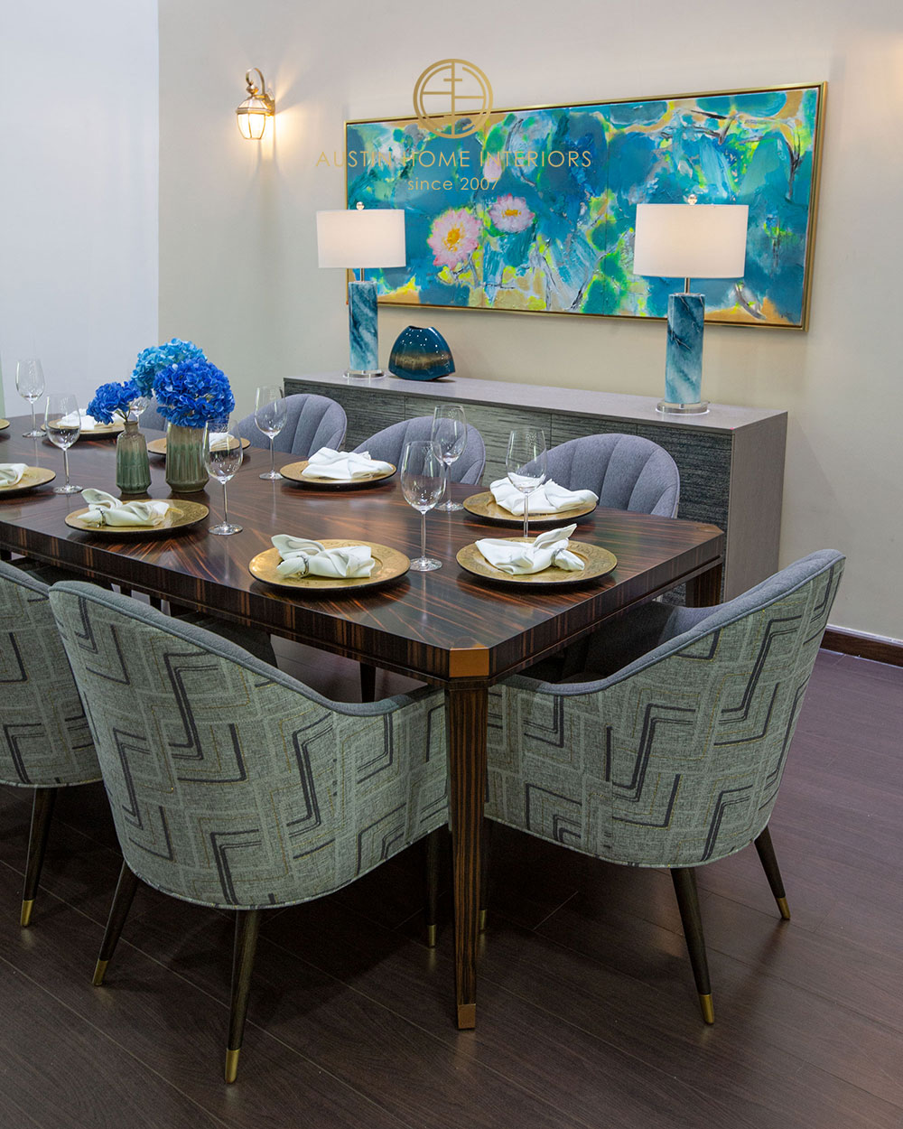 All elements come together under the gentle glow of twin table lamps in vivid blue, beside the poetic Lotus on the Mountain painting – breathing life and soul into the entire room.