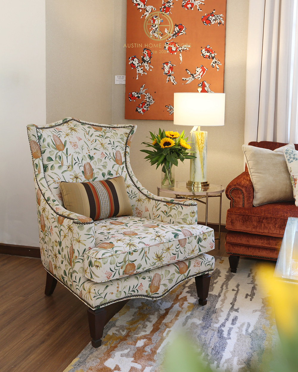 The Butterfly Armchair, with its botanical fabric inspired by Australian nature, showcases lively floral and leaf motifs that create a sense of calm. Opposite, the Isabella Sofa, with its curved back and rolled arms in warm tones, anchors the overall harmony.