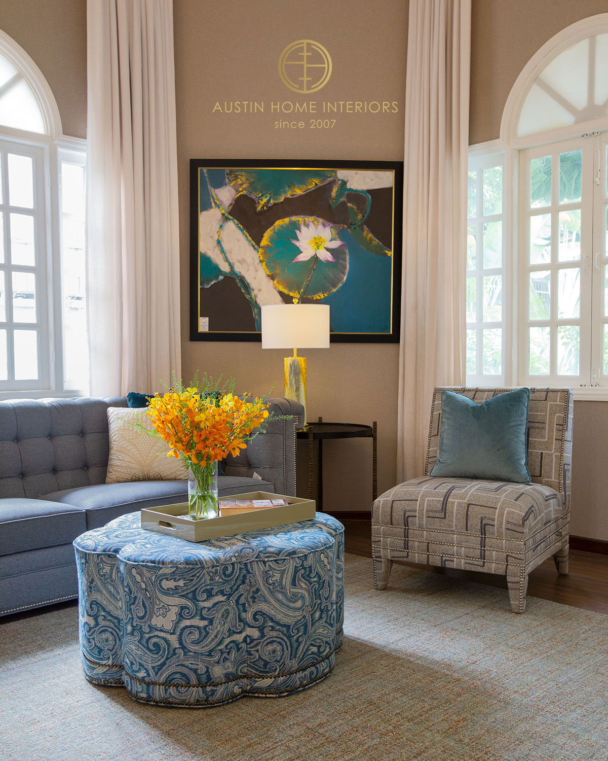 • A large flower-shaped ottoman, used as a coffee table, dressed in silver-blue paisley fabric — a graceful focal point amidst a neutral setting.