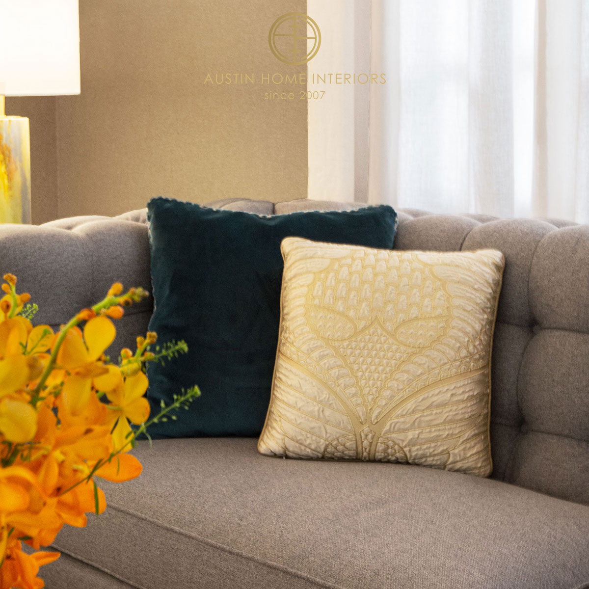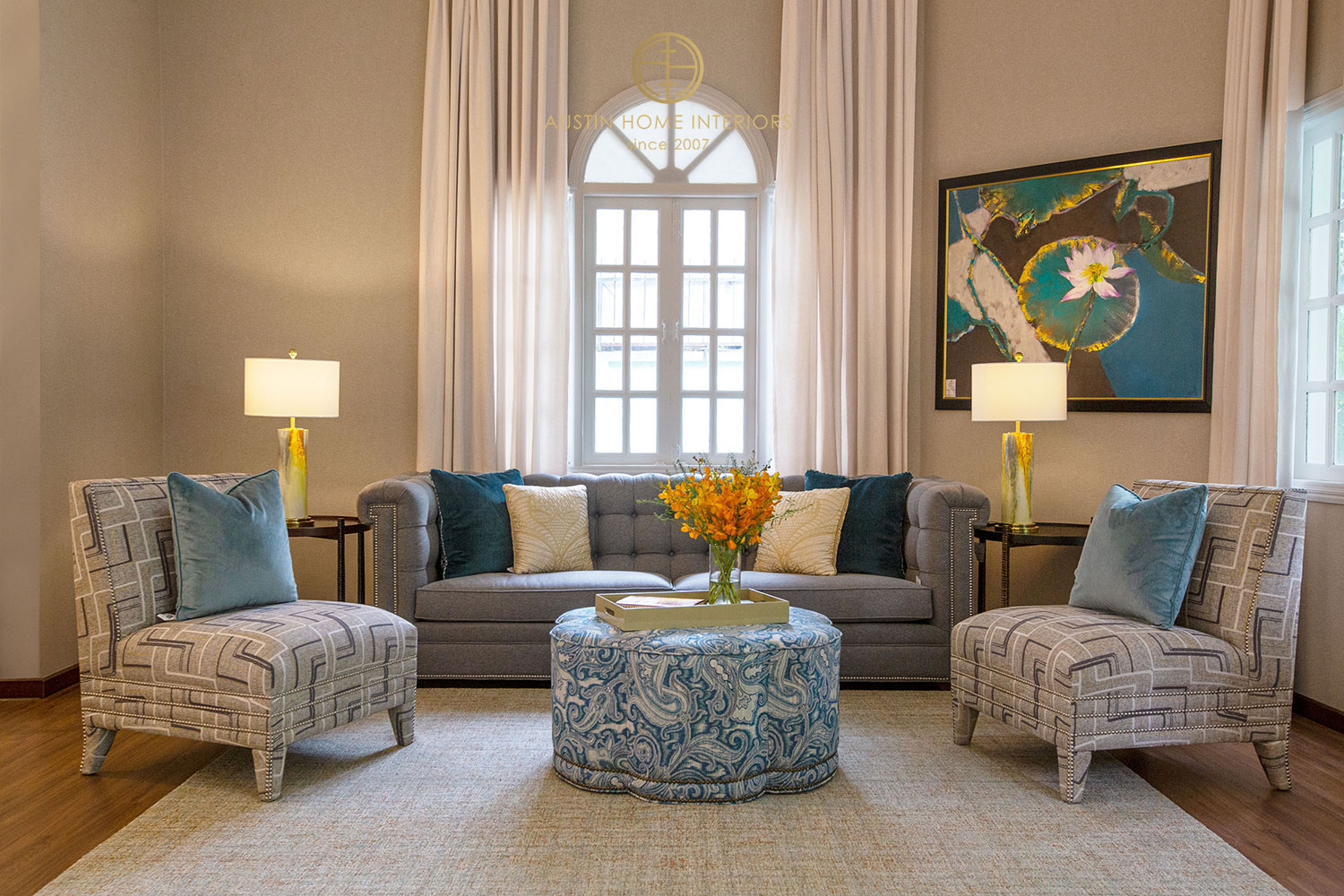 • A pair of armless accent chairs upholstered in geometric-patterned fabric, paired with teal velvet pillows — crisp yet refined.