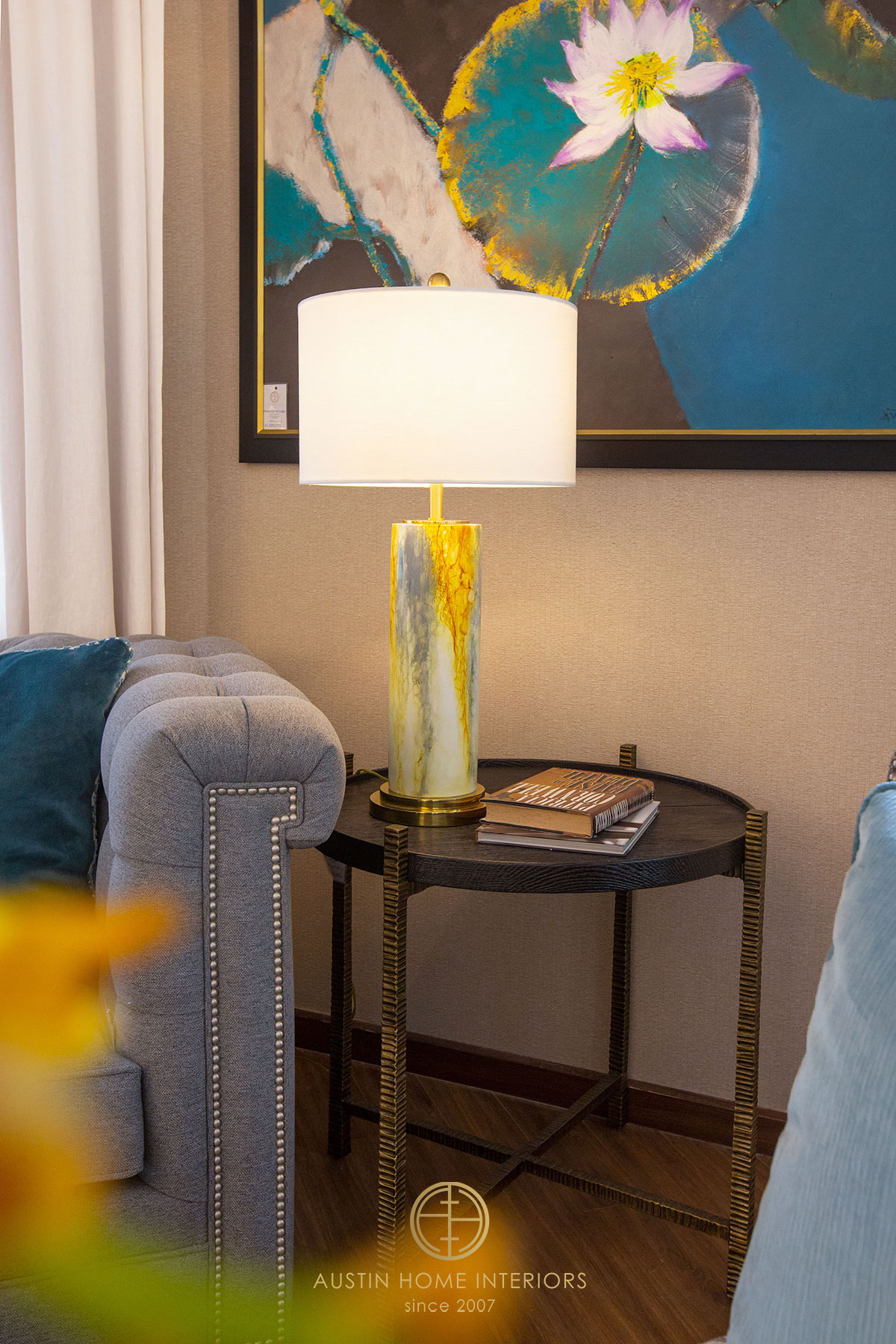 • A living space as gentle as an early summer breeze, where smoky grey, soft yellow, and sky blue hues intertwine to create an immediate sense of calm and comfort