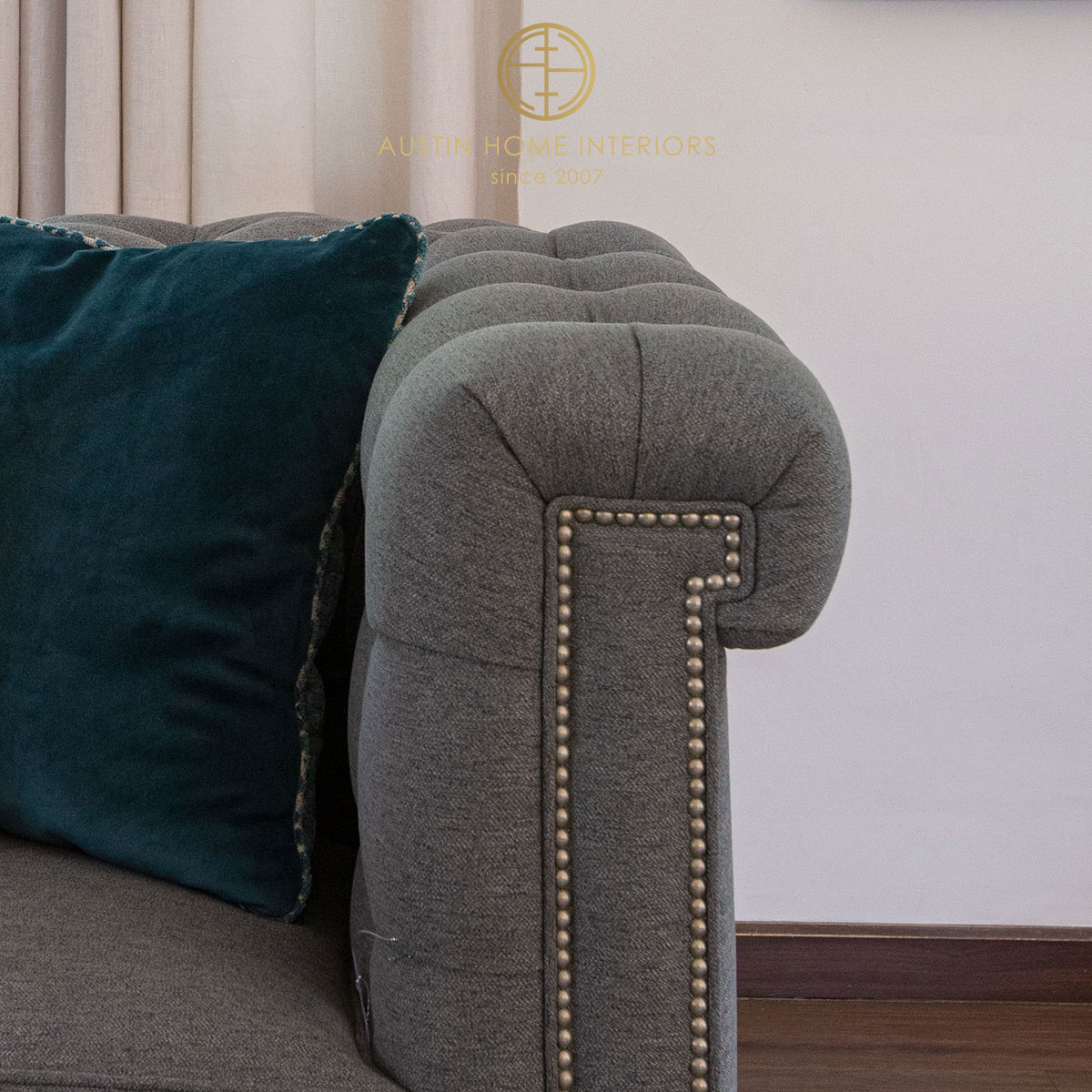 • A reinterpreted Chesterfield sofa with square, keyhole-shaped arms — sturdy in form, captivating in presence.