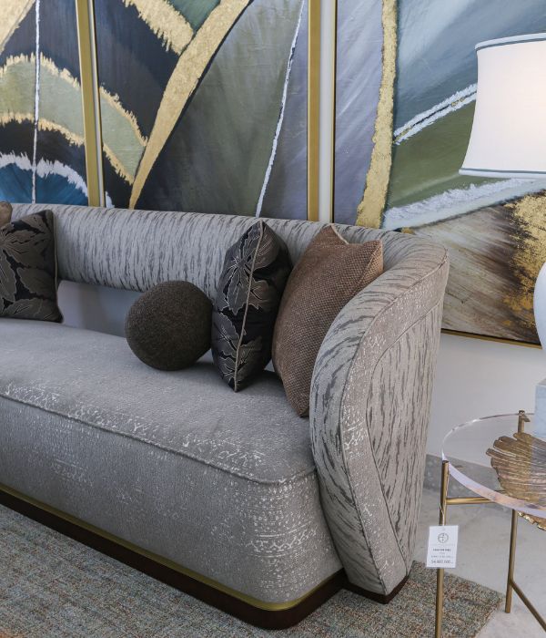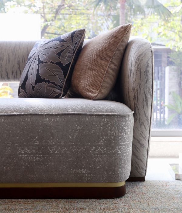 Sofa Ori có dáng lưng bo cong liền mạch; phần lưng bọc vải trừu tượng màu xám tạo chiều sâu, phần ngồi dùng chenille mềm ấm mang lại sự thoải mái. Chân gỗ viền gold mờ tạo điểm nhấn nhẹ nhàng.