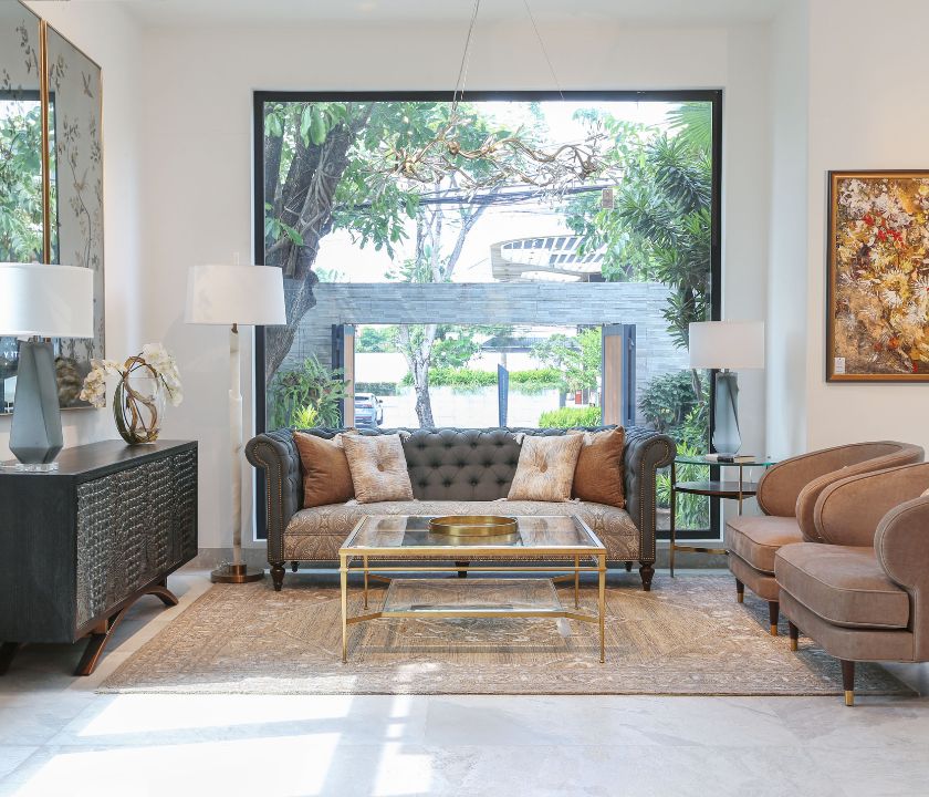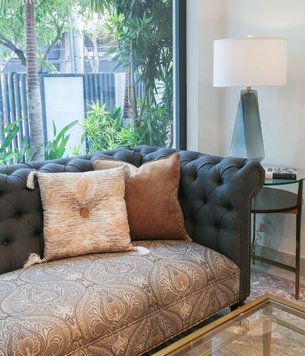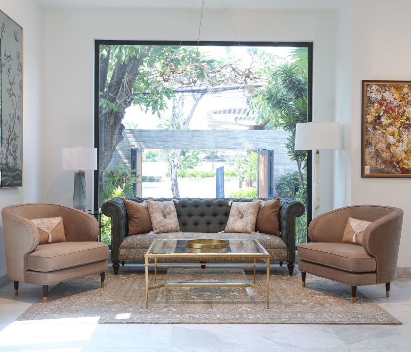 Sofa phong cách tân cổ điển châu Âu, nổi bật với thiết kế chần nút sâu sang trọng và tay cuộn mềm mại, điểm xuyết đinh tán kim loại tinh tế. Đệm ngồi bọc vải hoa văn cao cấp, êm ái và bền đẹp. Chân gỗ tự nhiên chắc chắn, phù hợp cho phòng khách cao cấp, biệt thự, khách sạn và không gian sang trọng.