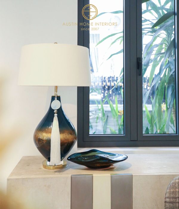 Tâm điểm của không gian là bàn ăn Symphony với mặt đá marble tự nhiên vân xanh trắng, mỗi mặt bàn là phiên bản độc nhất của thiên nhiên - không trùng lặp, mang đến sự sang trọng độc bản cho ngôi nhà. Phần chân bàn được hoàn thiện bằng kỹ thuật dán lá vàng tinh tế. Đi cùng là bộ ghế ăn Lara bọc vải dệt cao cấp từ thương hiệu Jim Thompson, nổi bật với thiết kế lưng uốn cong nhẹ nhàng, vừa tạo cảm giác thoải mái khi sử dụng, vừa góp phần tôn lên nét mềm mại cho tổng thể không gian.