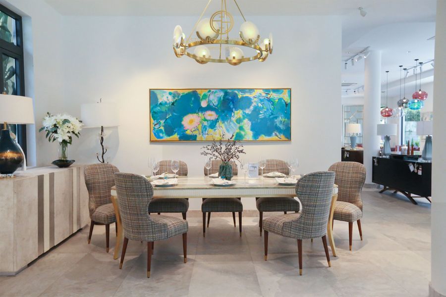 Tủ Pristine được hoàn thiện kiểu beluga, kết hợp cùng đèn chùm Astralis từ thương hiệu John Richard. Hoàn thiện không gian là bức tranh Sen Trên Núi đầy nghệ thuật mang đến cảm giác thư thái, thanh nhã cho toàn bộ không gian.
