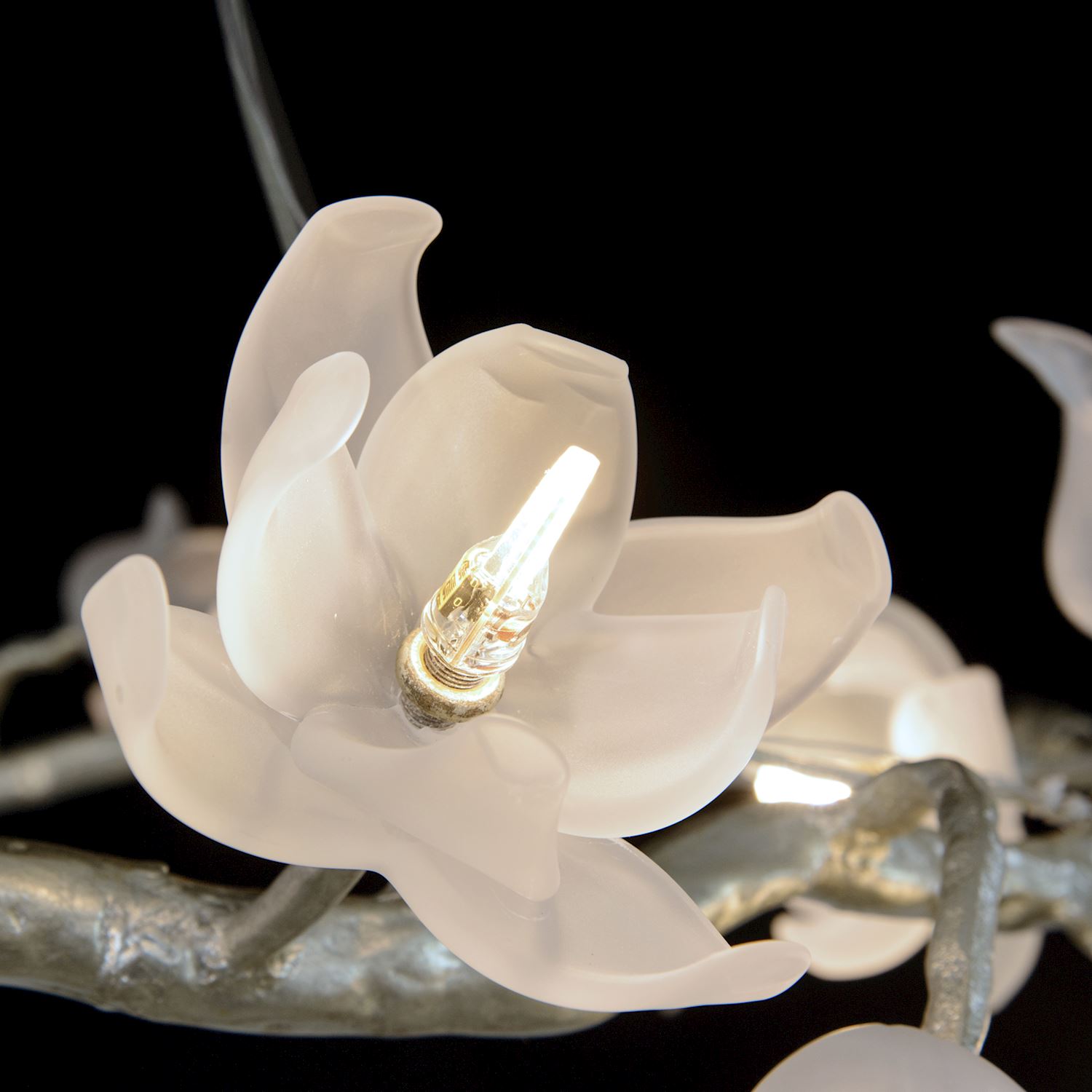 Đèn chùm tròn này có các nhánh phủ lớp lá bạc, được trang bị 12 bóng đèn hình hoa mộc lan làm từ thủy tinh thổi mờ thủ công và 14 bông hoa tulip trang trí cũng bằng thủy tinh thổi mờ, tạo nên vẻ đẹp tinh tế và sang trọng cho không gian.