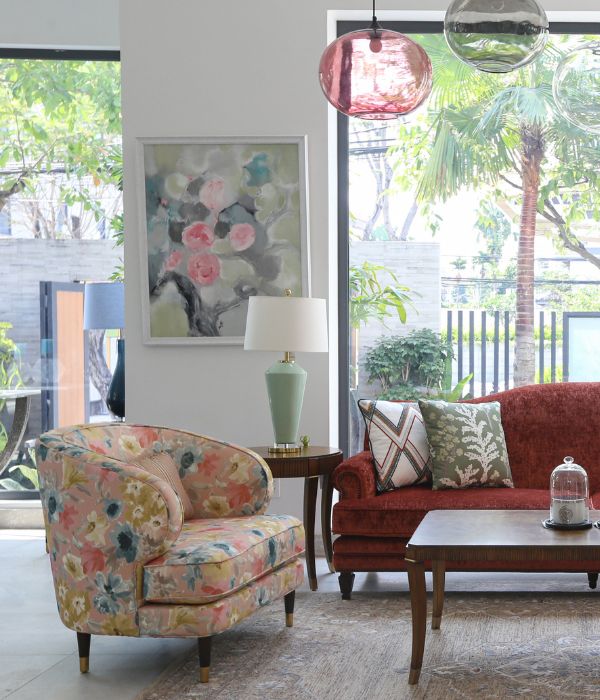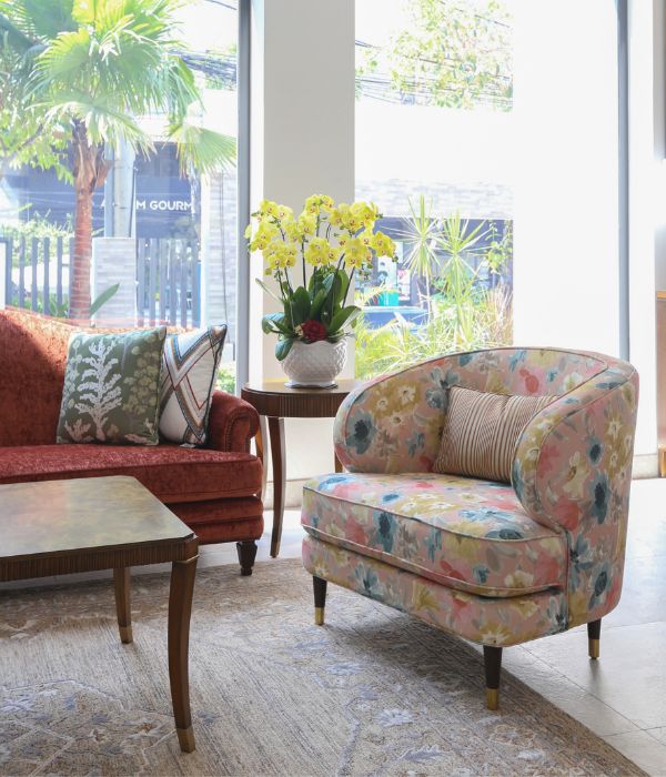 Ghế bành thư giãn bọc vải cao cấp từ Úc, thiết kế bo tròn mềm mại với họa tiết hoa mang đến vẻ đẹp tinh tế và hiện đại.
