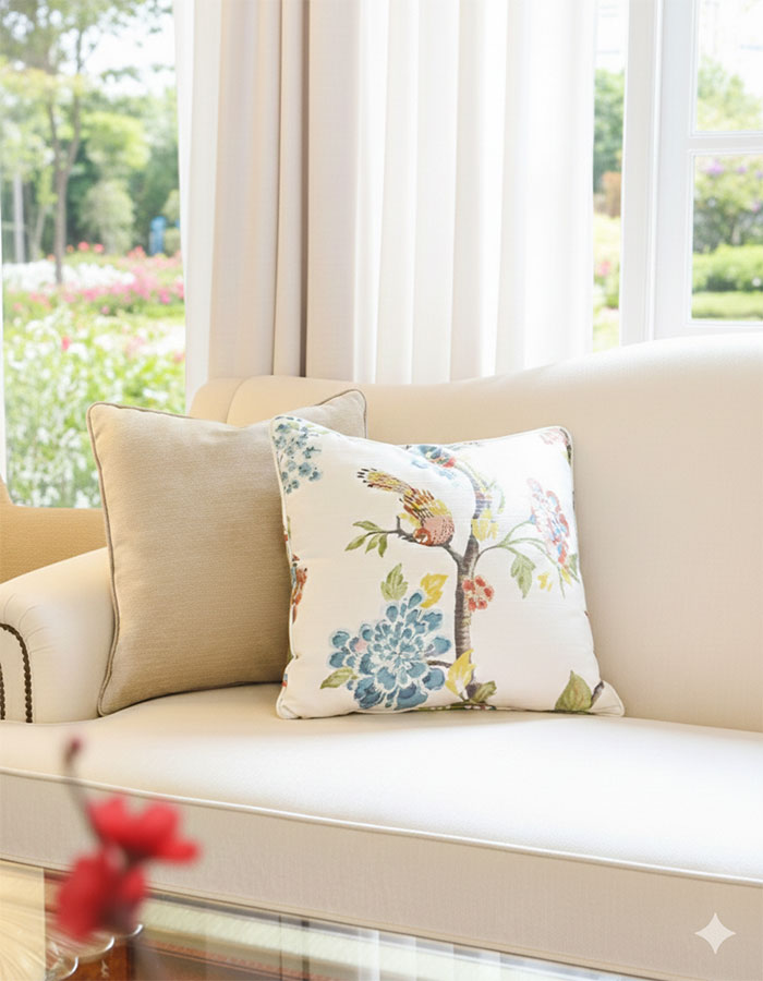 Gối vuông trong vải bọc Robert Allen - thương hiệu vải cao cấp Mỹ. Gối có họa tiết hoa lá, gam màu pastel trang nhã. Đường nét mềm mại trên nền vải cotton tạo cảm giác thủ công tinh tế, mang đến vẻ đẹp trầm lắng và thư thái cho không gian sống.
